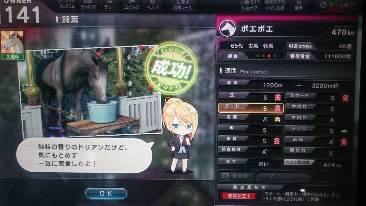 飼葉は遠征の適性を強化できるドリアンを中心に色々な飼葉を使用していきたいと思います!
